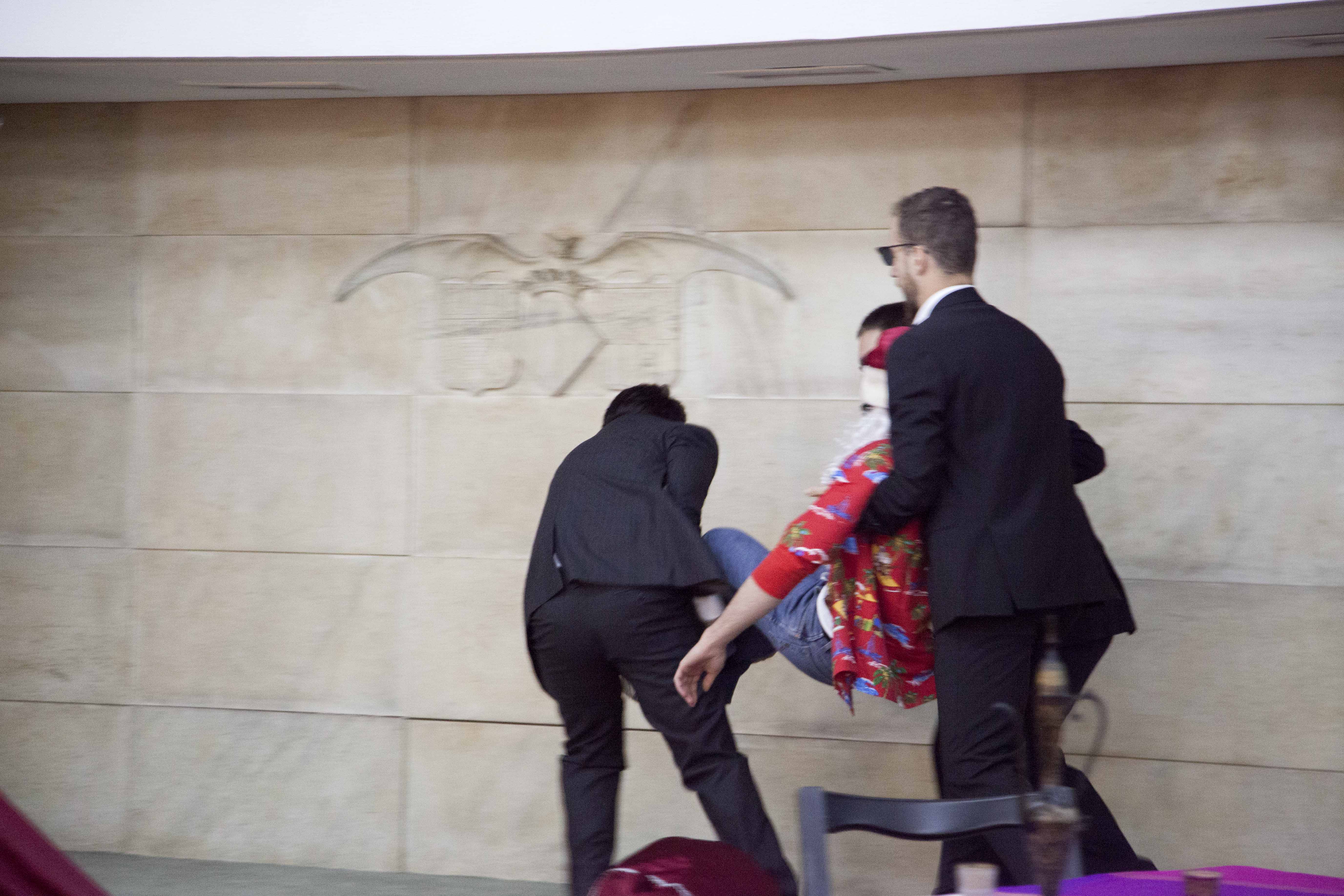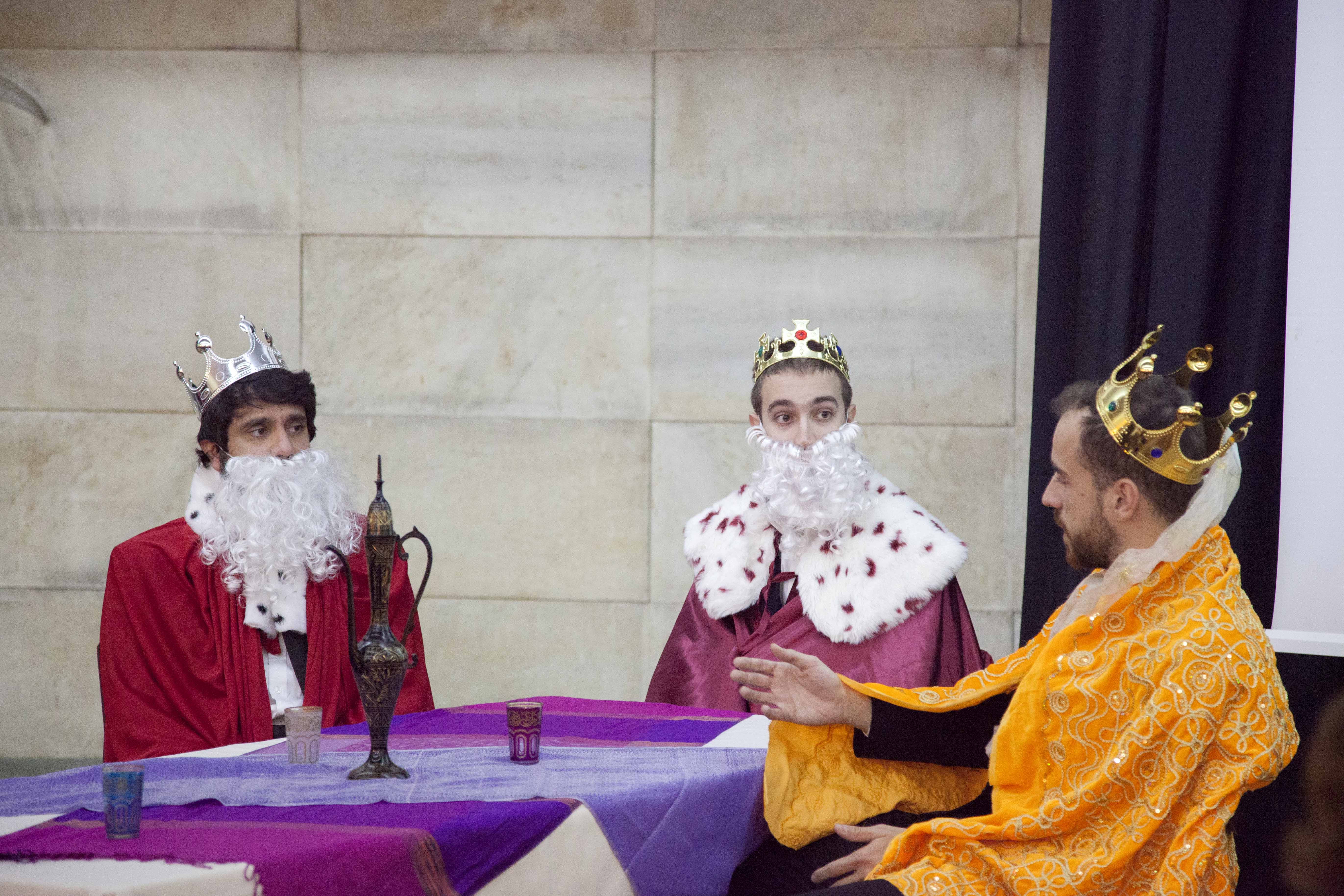 La obra implicaba la participación de tres valientes voluntarios para salvar a Дед Мороз de las garras de los Tres Reyes Magos. Debían superar tres pruebas con los ojos tapados. La primera consistía en identificar cuál de los tres objetos que se entregaban era ruso.