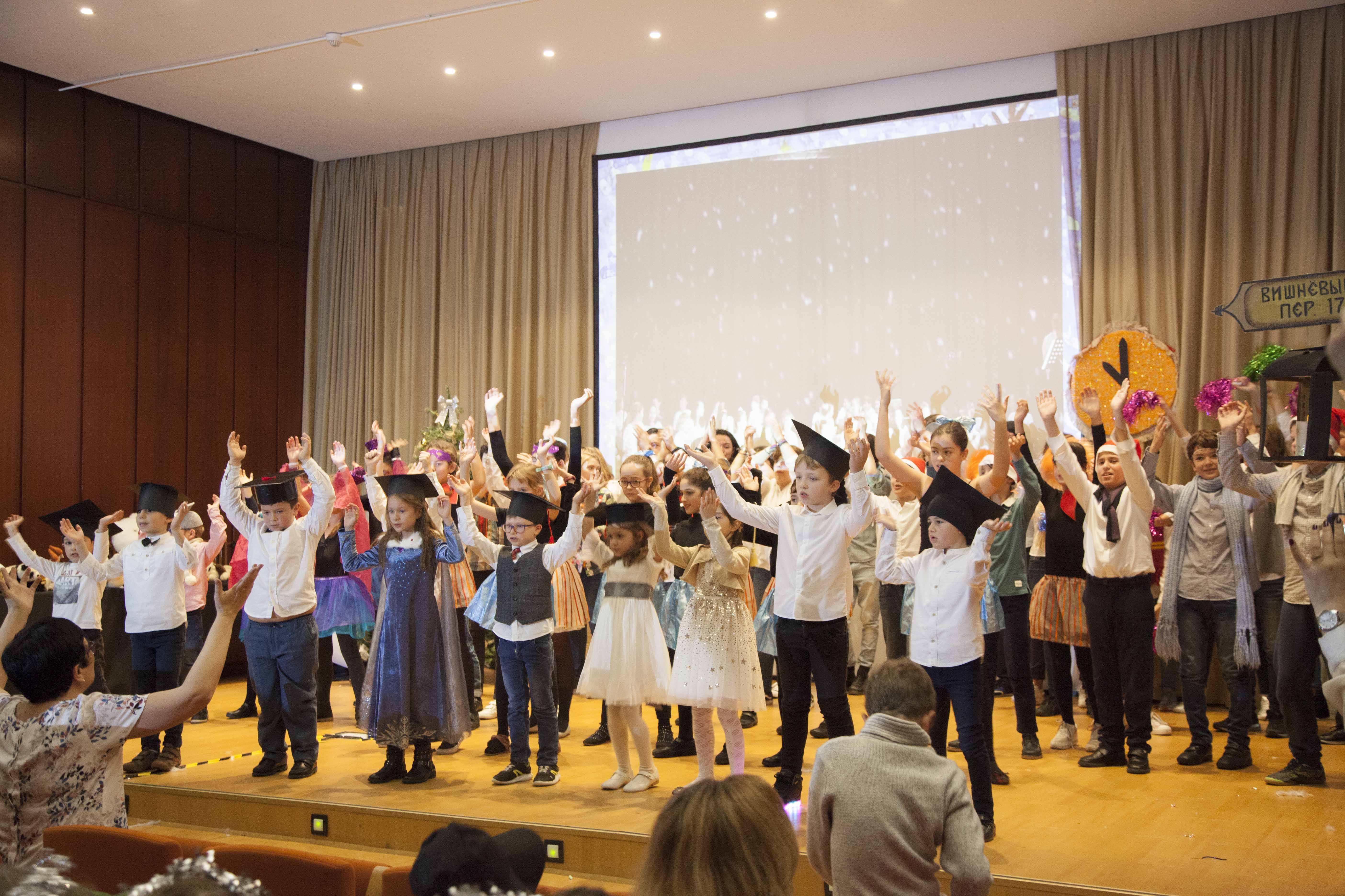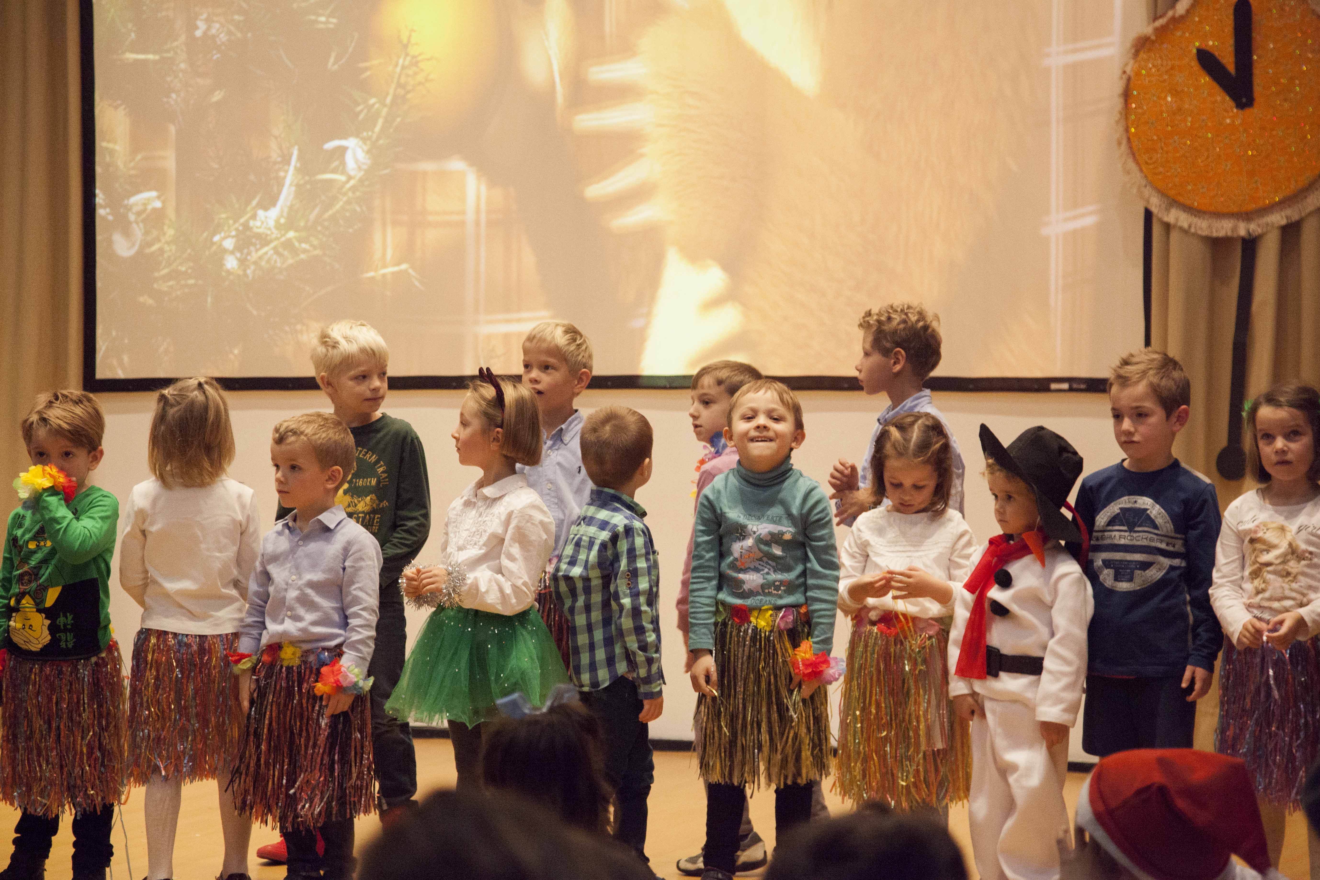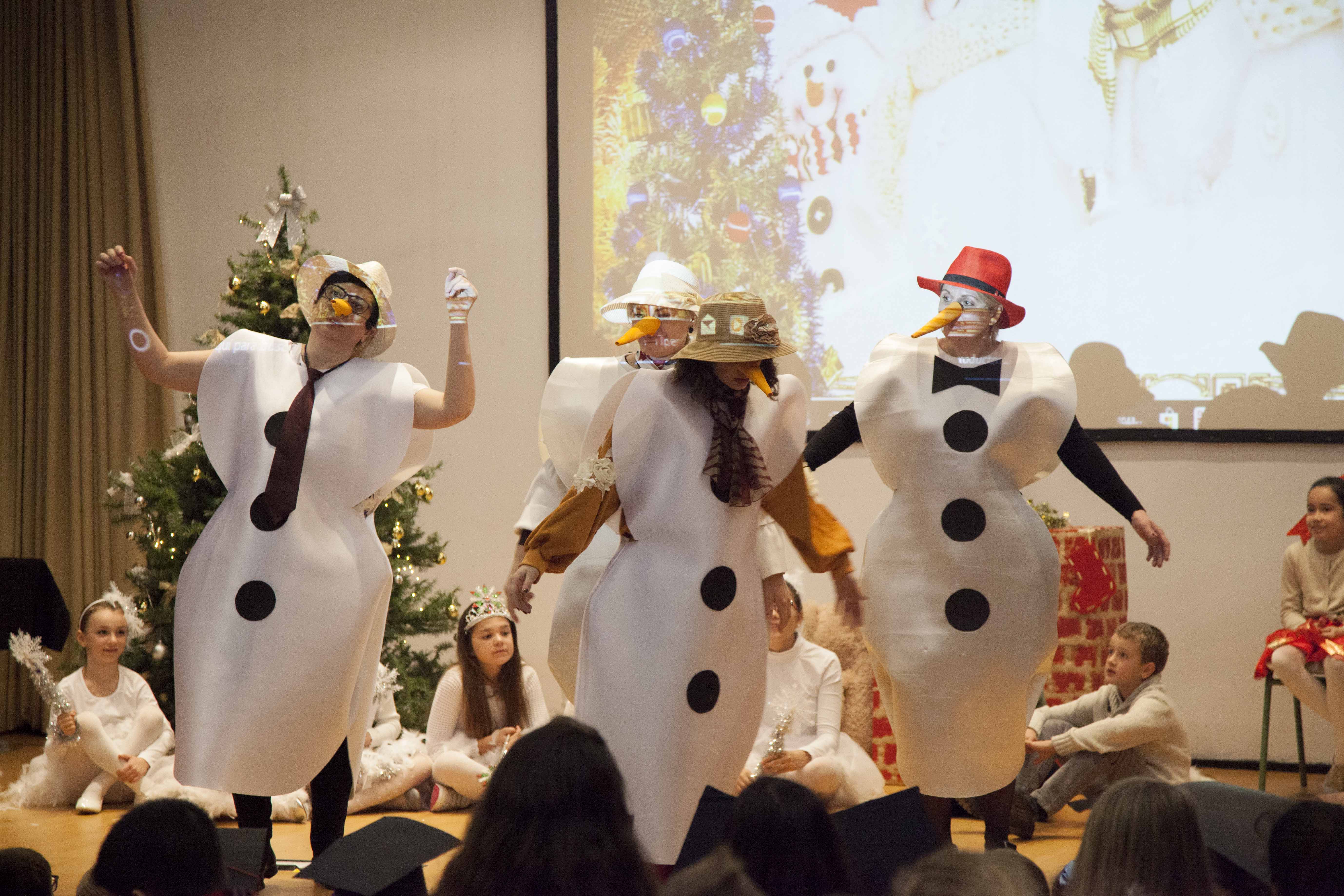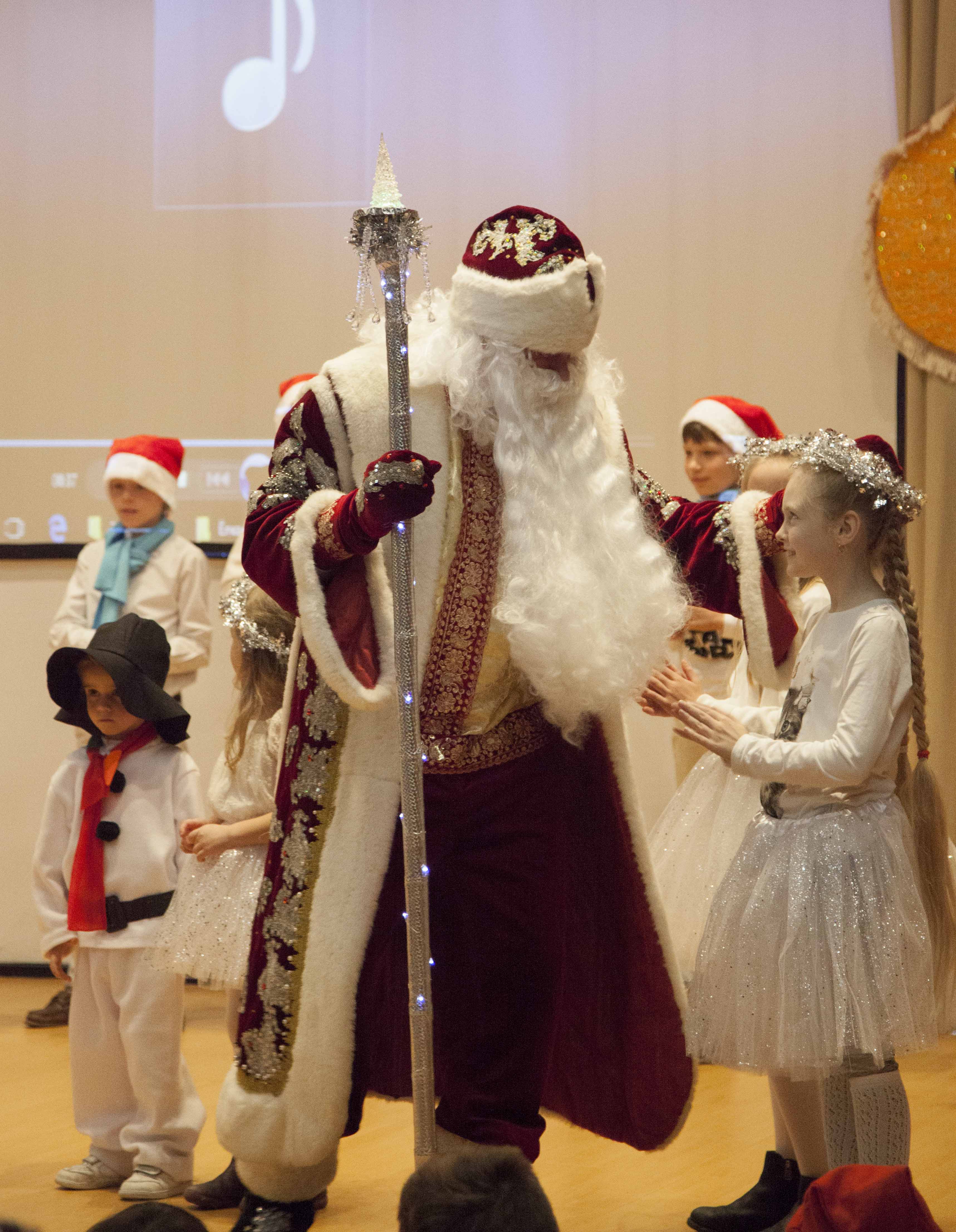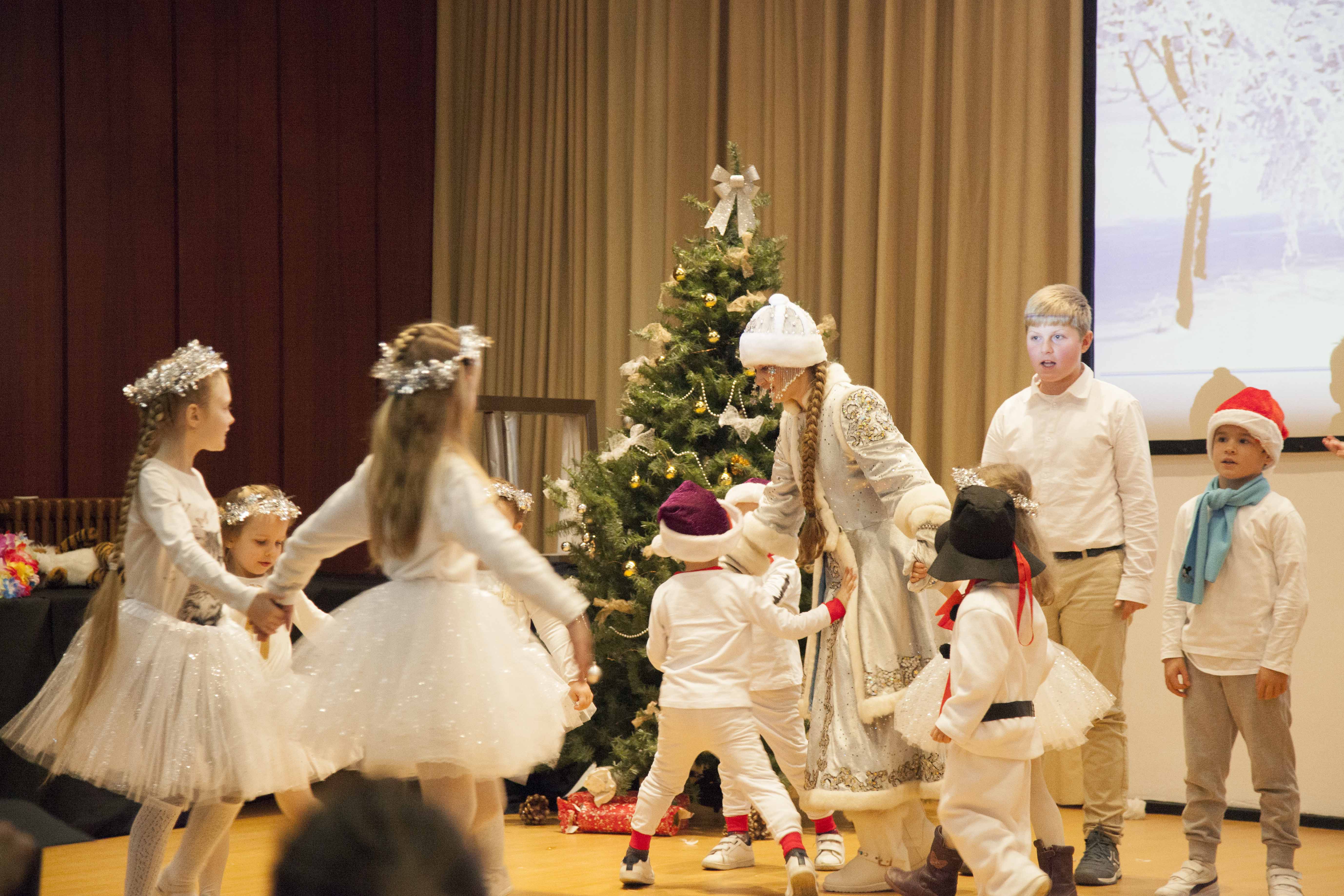 Los alumnos también cantaron la canción Ледяная девочка y los niños de cuatro años bailaron el baile de copos de nieve y muñecos de nieve con Снегурочка.