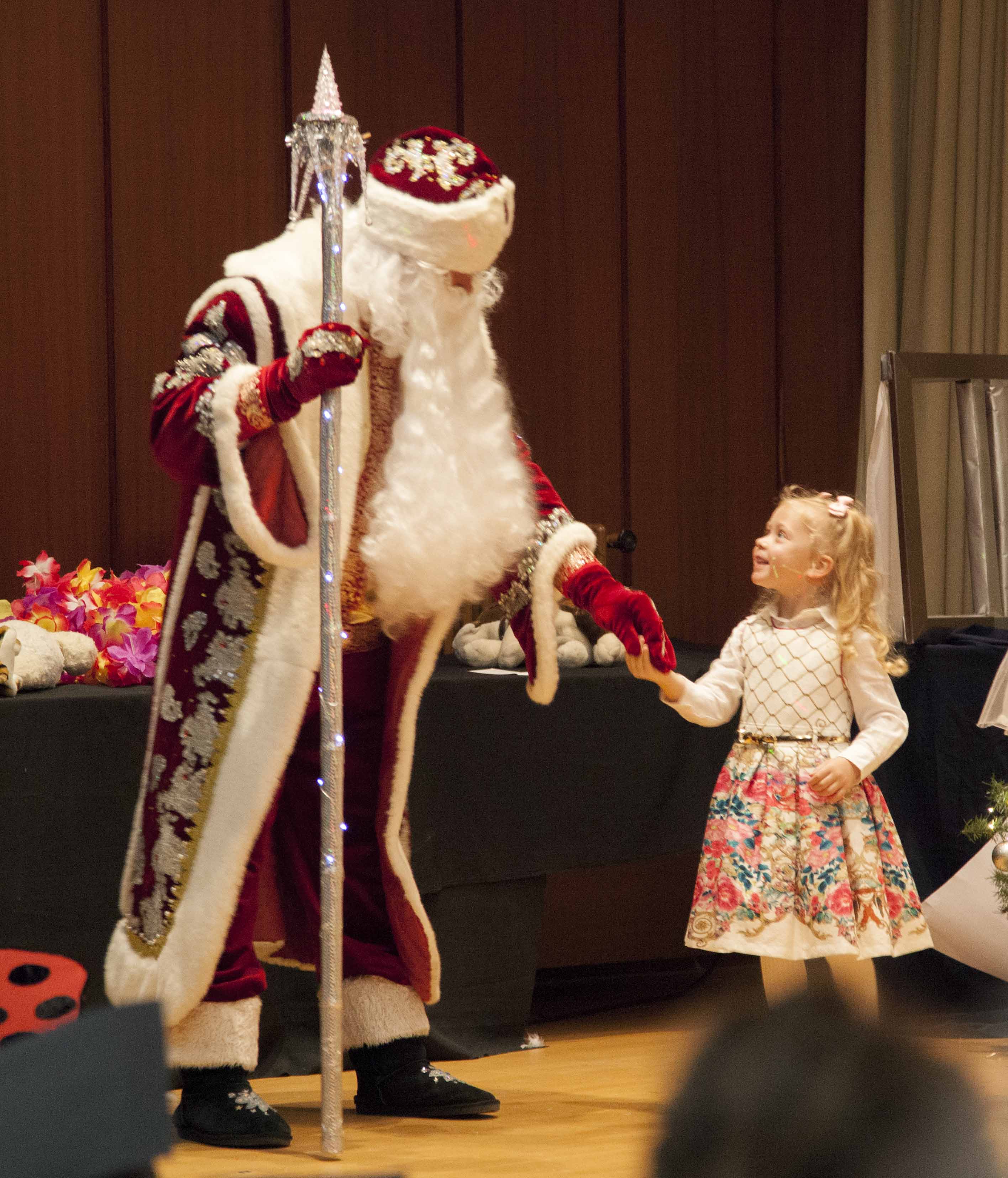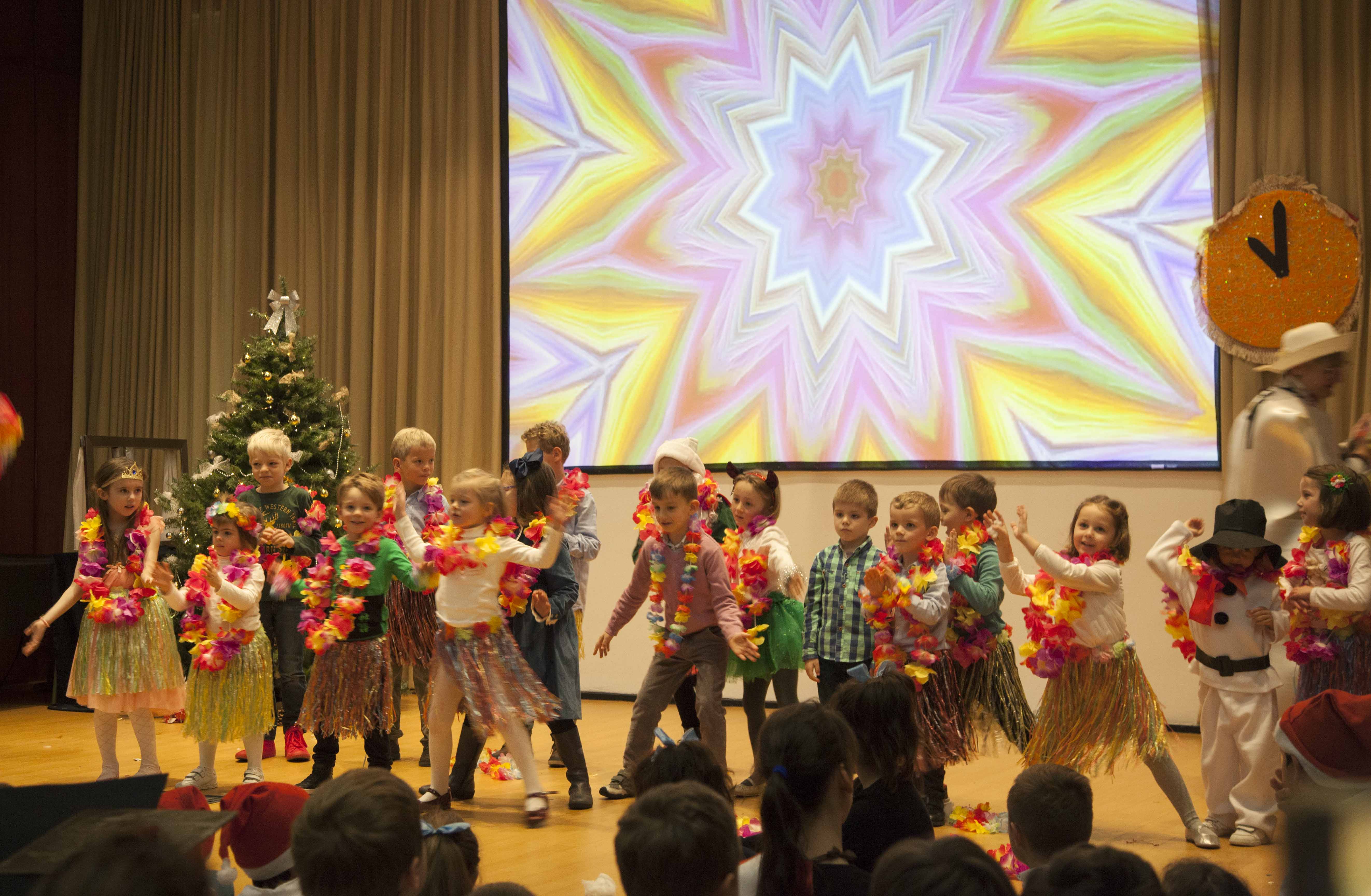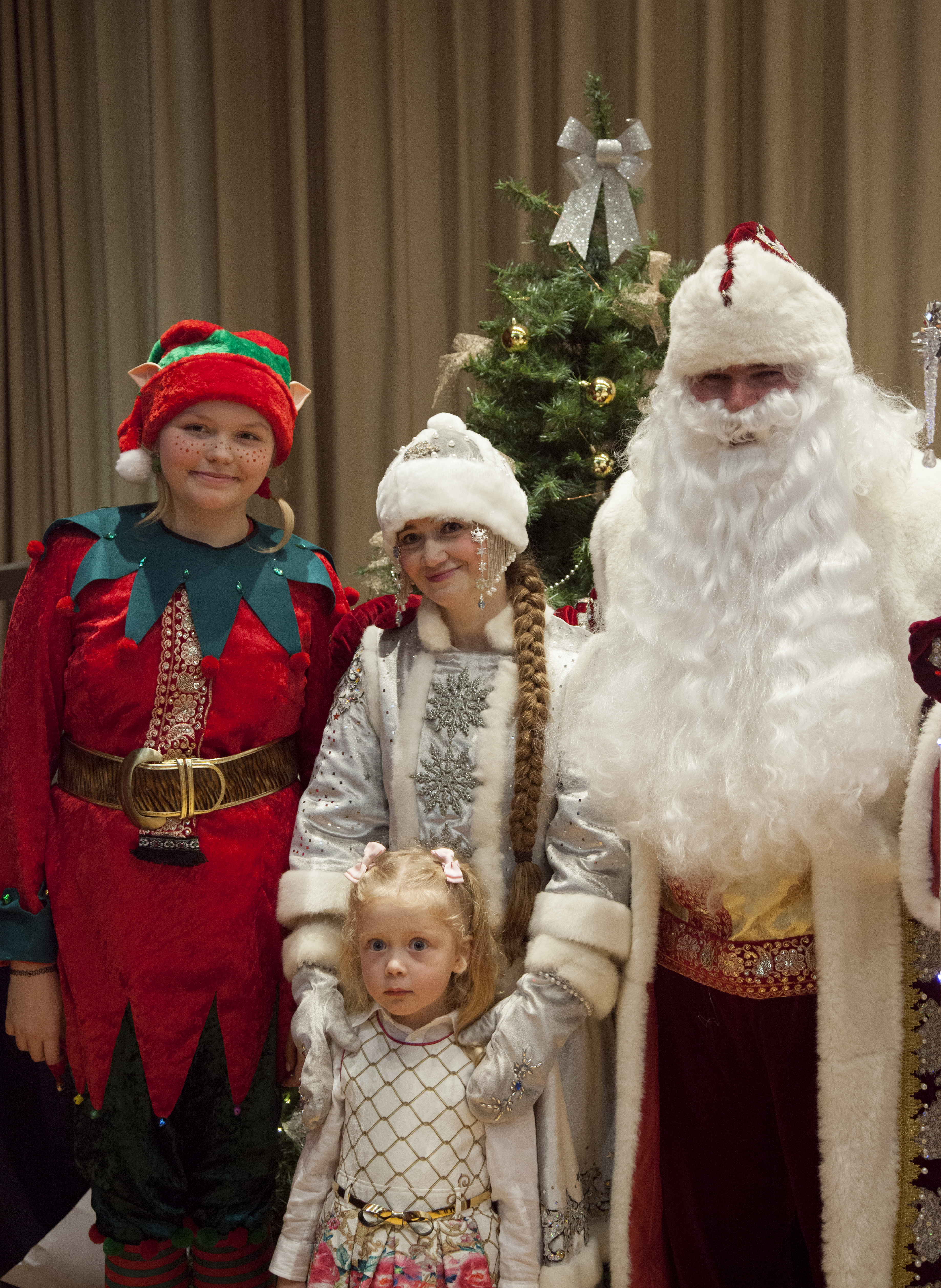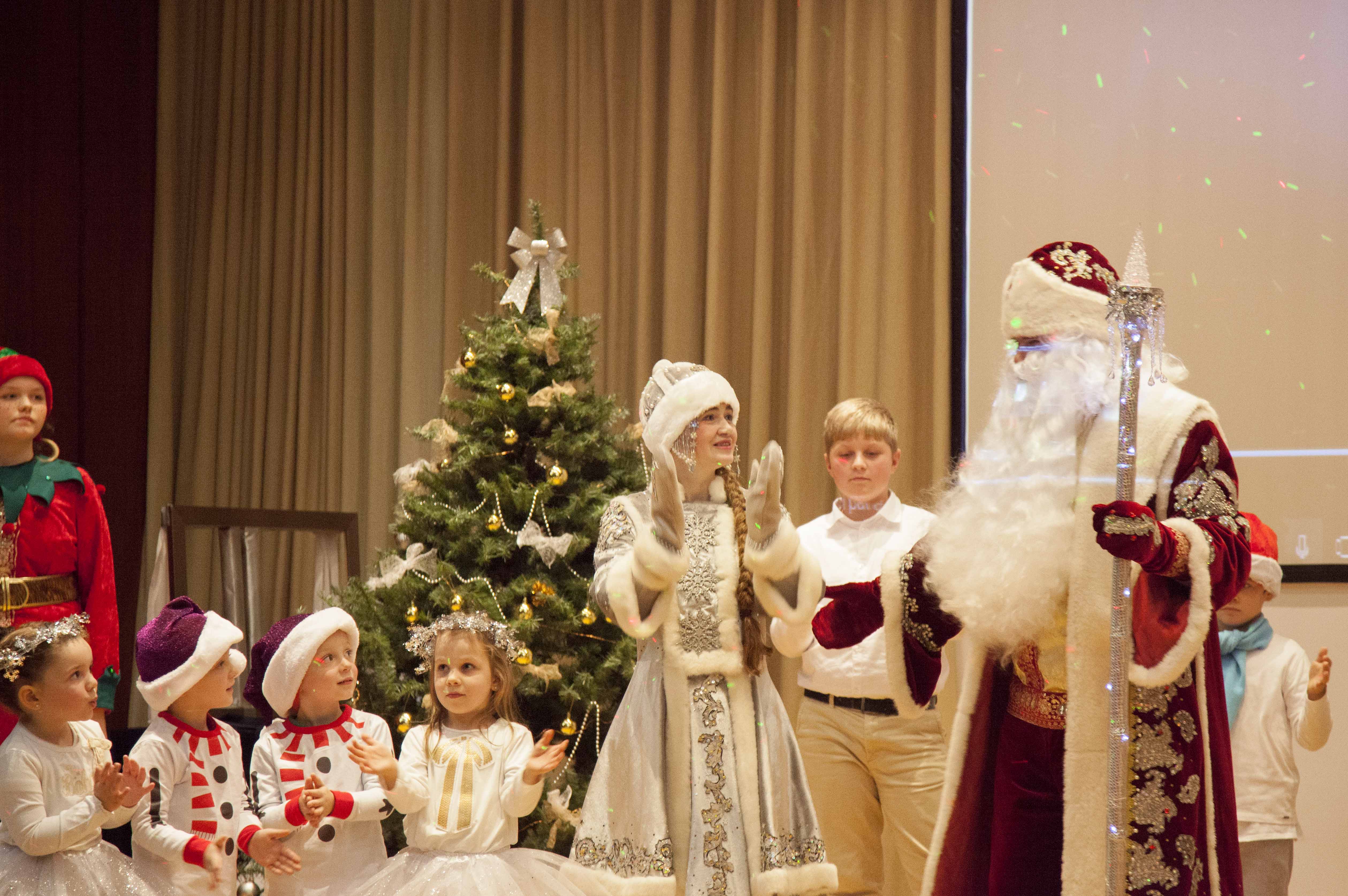 Los participantes más jóvenes estaban un poco confundidos por el gran número de personas, una pantalla brillante y un gran sentimiento en el escenario. Pero, con la ayuda de Баба-Яга y el muñeco de nieve, y escuchando las melodías familiares de Чунга-Чанга, bailaron con entusiasmo. Después de alegres bailes, un impostor hawaiano de Дед Мороз fue expulsado y, en su lugar, ¡nuestro muñeco de nieve y nuestro querido Дедушка llegaron con toda una bolsa de maravillosos regalos, música y sorpresas para jugar!