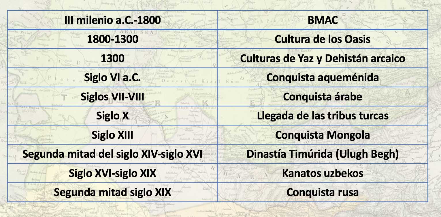 La historia de Asia Central se remonta a mucho tiempo antes de la época del “maldito” Gengis Jan. Los investigadores han encontrado pruebas de que en el III milenio a.C. se desarrolló en esta zona, especialmente en el delta del Murgab, una próspera civilización urbana, conocida como BMAC (Bactria-Margiana Archaeological Complex), cuyo origen no está claro, es decir, no se sabe si fue un desarrollo local o debido a influencias externas. Estas ciudades siguen la definición mesopotámica, con fortificaciones, templos, palacios, etc., y están dotadas de una importante organización administrativa. Están a las puertas de la escritura, tan cerca que muchos especialistas creen que el hecho de que no se hayan encontrado documentos escritos se debe a que aún queda mucho por investigar más que a que no la llegaran a desarrollar.