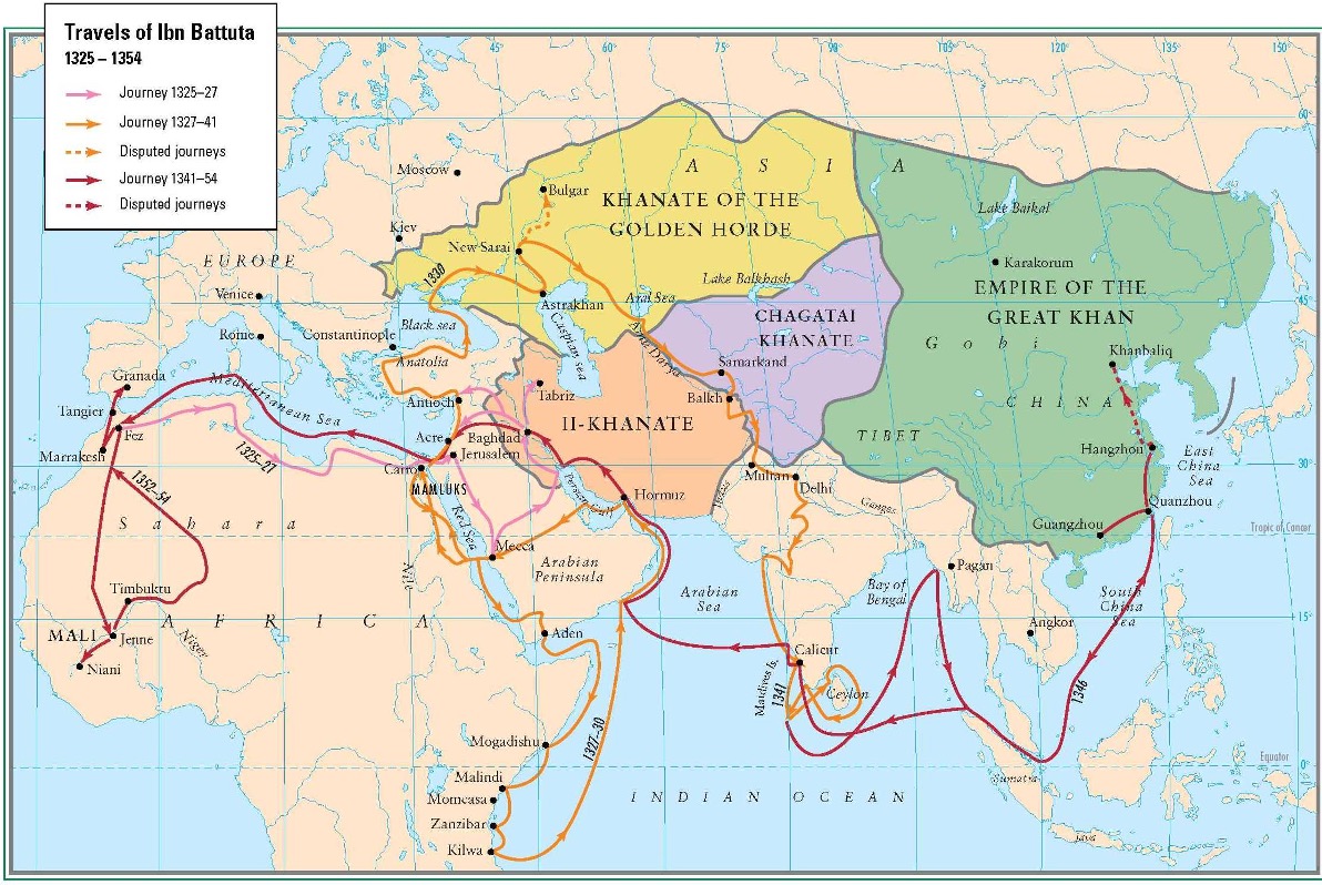Sabemos que Ibn Battuta nació en Tánger en 1304 (motivo por el que se le conoce como el Tangerino) y falleció en Marruecos bien en 1368-9 o en 1377. Empezamos a saber de su vida con motivo de su partida el 13 de junio de 1325 en dirección a La Meca, con el designio de cumplir la peregrinación preceptiva en el islam (Hayy), que no completará hasta septiembre del año siguiente. En vez de volver a casa, Ibn Battuta decidió seguir viajando, recorriendo Irak y la parte sudoccidental de Irán, para volver a La Meca, donde viviría tres años. Después de estos años vuelve a sentir la llamada de la aventura, y parte hacia Yemen y la costa oriental de África, para volver a la Meca desde Omán y el Golfo Pérsico. Esta vez la estancia será corta, y pronto reanudará su viaje, aunque esta vez hacia el norte, desde Egipto por la costa del Levante hasta Constantinopla, para continuar hacia los territorios de la Horda de Oro, y su capital Sarai, a orillas del Volga. Desalentado en su interés por ir a Siberia (a la que llama Tierra o País de las Tinieblas), cambia de parecer, y rodeando el mar Caspio por el norte llegará a Asia Central, que cruzará en su periplo hacia la India, donde residirá diez años, a los que sigue una estancia de año y medio en las Maldivas. Después seguirá su viaje hacia el este, hasta llegar a Sumatra, sin que se haya podido determinar si el relato de su viaje a China es fidedigno. Desde este extremo oriental de sus viajes viaja por cuarta y última vez a La Meca. Tras más de 20 años fuera vuelve al Magreb, aunque todavía no es el fin de sus viajes. Todavía le queda un viaje a al-Ándalus, que empezó con su incorporación a una expedición para auxiliar Gibraltar (la “Montaña de la Conquista”), amenazada por Alfonso XI de Castilla, aunque su muerte debido a la peste acaba con esta amenaza, por lo que Ibn Battuta decide recorrer el reino de Granada por placer. El último viaje le llevará el reino africano de Mali, recorriendo parte de Marruecos sobre la marcha. Con su vuelta a la corte del sultán en Fez se cierra la obra de Ibn Battuta, y poco es lo que se sabe de su vida posterior, como la fecha exacta de su muerte. En el año 1355, 30 años después del inicio de sus viajes, el sultán meriní le mandó recoger por escrito todos sus viajes, labor para la que contó con la colaboración del escritor granadino Ibn Yuzayy, el cual realizó la redacción completa del libro siguiendo los dictados que le iba haciendo Ibn Battuta.