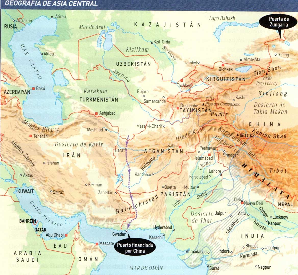 En esta conferencia, al hablar de Asia Central nos referimos a la zona que cubren las antiguas repúblicas soviéticas de Asia Central, situadas en una gran depresión de unos 2.000 km de norte a sur y de este a oeste que se inclina hacia el Caspio. Forma parte de la zona árida del planeta, estando ocupada mayoritariamente por estepas y desiertos. La población vive concentrada al pie de las montañas, donde se encuentra los principales cauces de agua producidos por el deshielo veraniego, o a lo largo del cauce de los ríos, destacando entre ellos el Amu Daria y el Sir Daria, el Oxus y el Yaxartes de los antiguos griegos, cuyas aguas apenas llegan al mar de Aral, pues son explotadas más arriba para la irrigación de los campos de algodón. El desecamiento de las principales masas de agua de la región, el mar de Aral y el mar Caspio, es un grave problema para todos estos países.