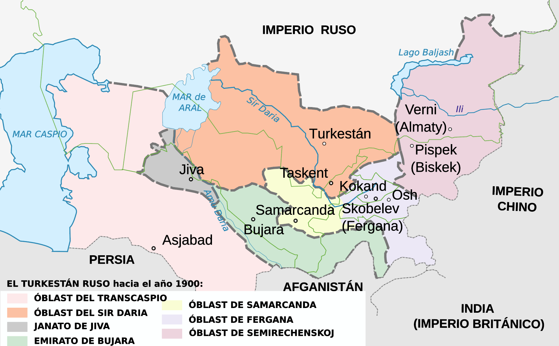 La penetración rusa en la zona comenzó en el siglo XVIII, y se desarrolló plenamente en el XIX, cuando se comenzó a conocer esta región como el Turquestán ruso, gobernado desde Tashkent. Esta expansión rusa en Asia Central fue vista con preocupación por los británicos, que temían la amenaza rusa sobre la India, ya fuese directa o indirecta. Se inició así una etapa de guerra fría que la literatura inglesa denominó como “el Gran Juego”. Para Rusia esta expansión suponía la pacificación de la frontera siberiana, la consolidación de su estatus como potencia económica y la apertura de mercados cautivos para la industria rusa. Las otrora poderosas hordas kazajas fueron sometidas entre 1820 y 1850, aunque el territorio no estaría completamente pacificado hasta 1875. Después vendría la conquista de los kanatos del Sir Daria y del Amu Daria, que se produce entre 1864 y 1873. Finalmente se somete a las tribus turkmenas, entre 1879 y 1884.