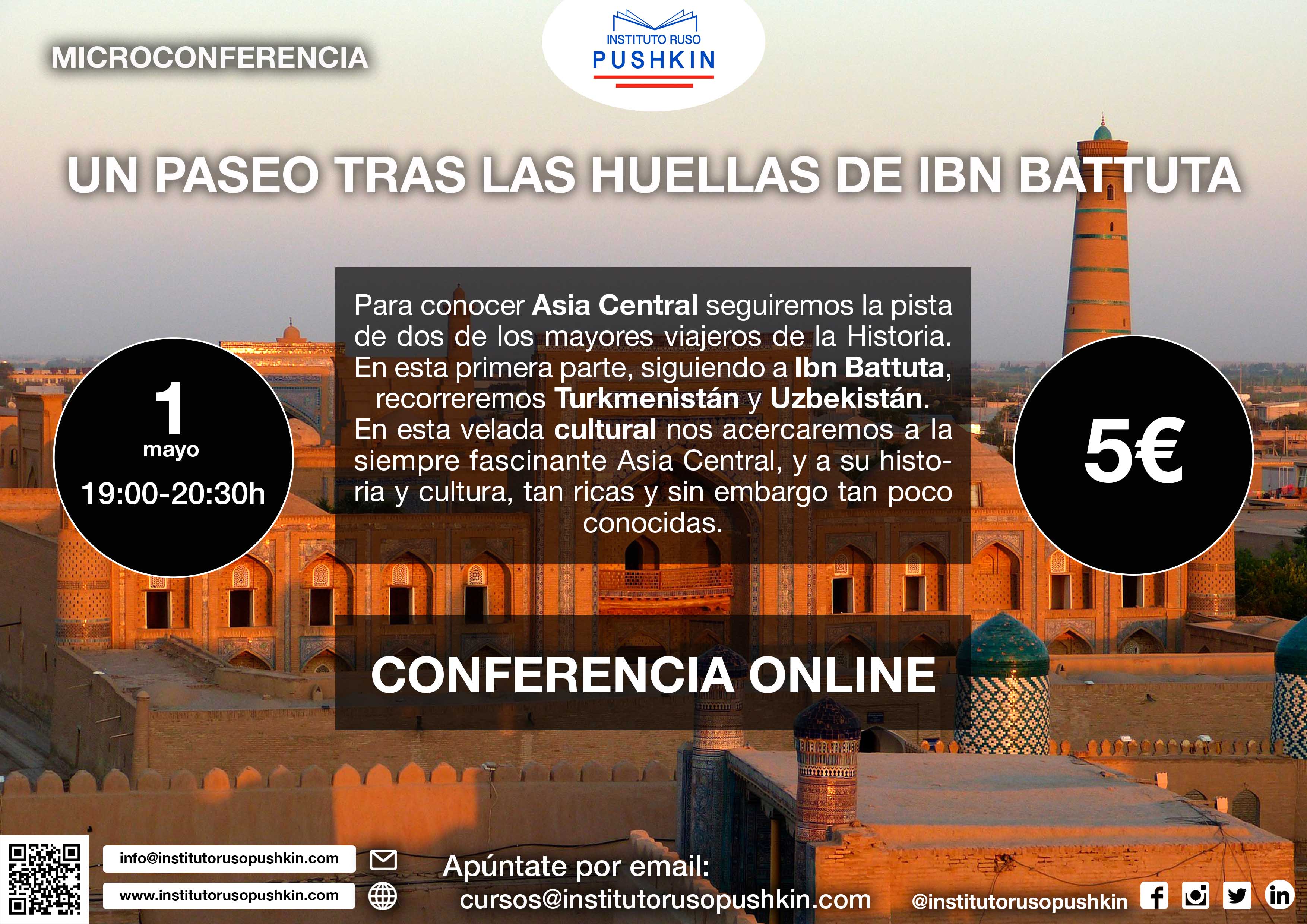 El pasado viernes 1 de mayo tuvo lugar la quinta microconferencia del ciclo de este curso, "Un paseo tras las huellas de Ibn Battuta", sobre Turkmenistán y Uzbekistán, impartida por nuestro alumno Iván Álvaro Herrero, historiador y estudiante de filología.