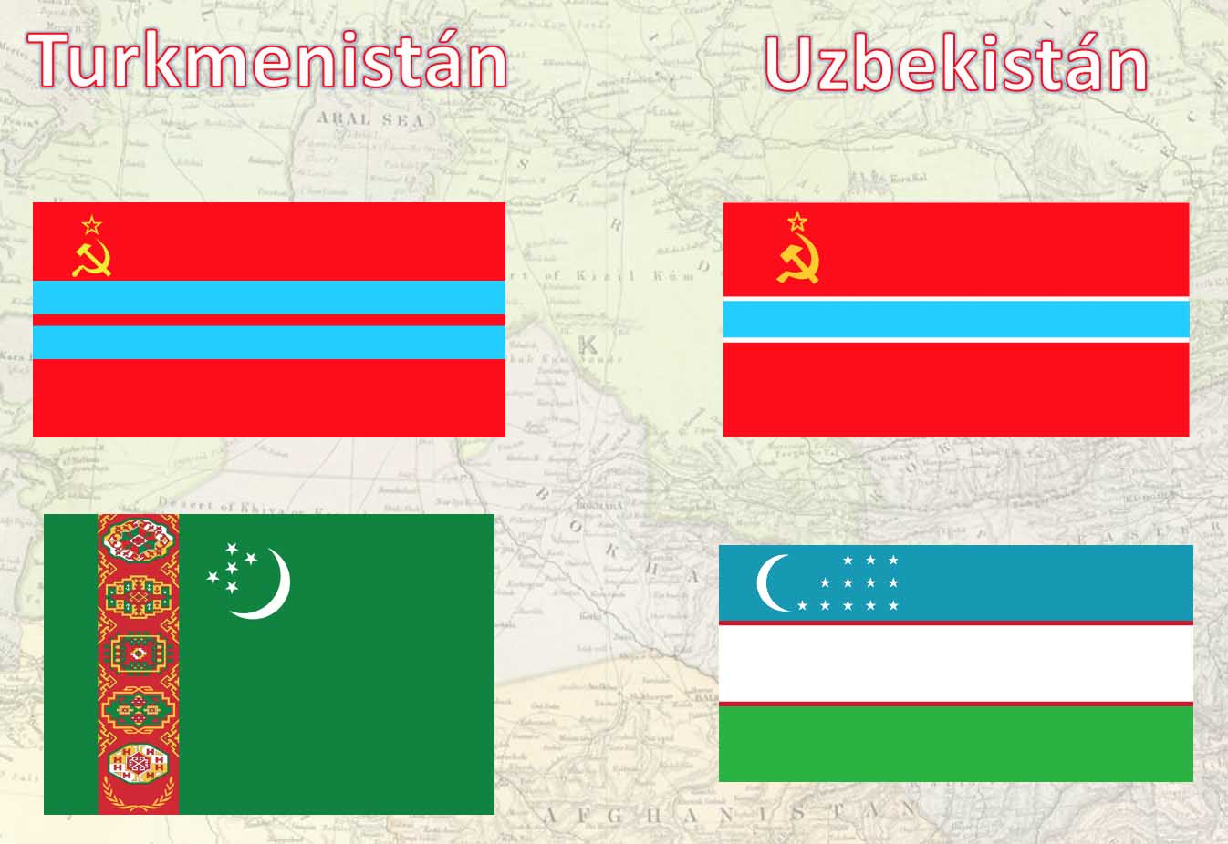 La andadura de Uzbekistán y Turkmenistán comienza con la disolución de la URSS en 1991. De todas las antiguas Repúblicas Soviéticas, las de Asia Central son las que menos han desarrollado reformas democráticas al estilo occidental; en algunas de ellas, como en Turkmenistán, ni siquiera nominalmente. Tanto en Uzbekistán como en Turkmenistán hay sospechas más que fundadas de que todas las elecciones producidas desde la independencia han sido más o menos fraudulentas, y ambos casos solo ha habido dos presidentes, y solo porque el primero había fallecido (en Uzbekistán Karimov, muerto en 2016, al que sucede Mirziyoyev; en Turkmenistán Niyazov [también conocido como Turkmenbashi, “líder de los turcos”], muerto en 2006, al que sucede Berdimuhamedov). En ambos países se han desarrollado políticas de consolidación y desarrollo de la conciencia nacional, aunque en el caso de Turkmenistán las políticas de Niyazov tuvieron un claro carácter megalómano. En estos países de tan reciente historia era necesario este tipo de proceso, ante la ausencia de antecedentes históricos claros.