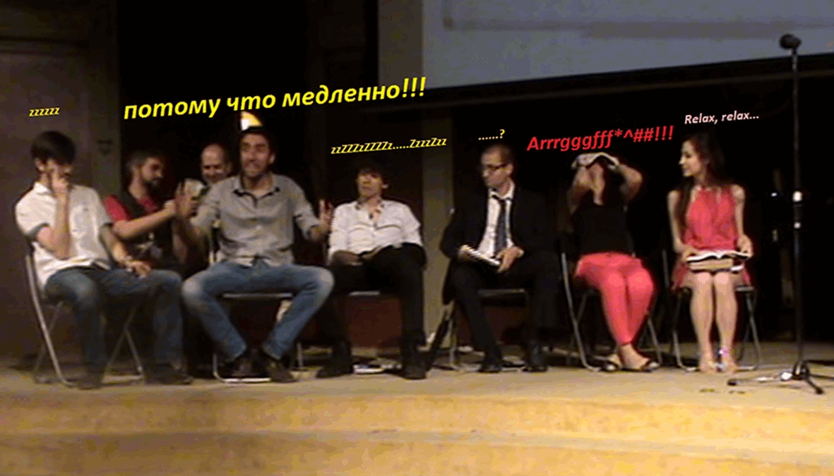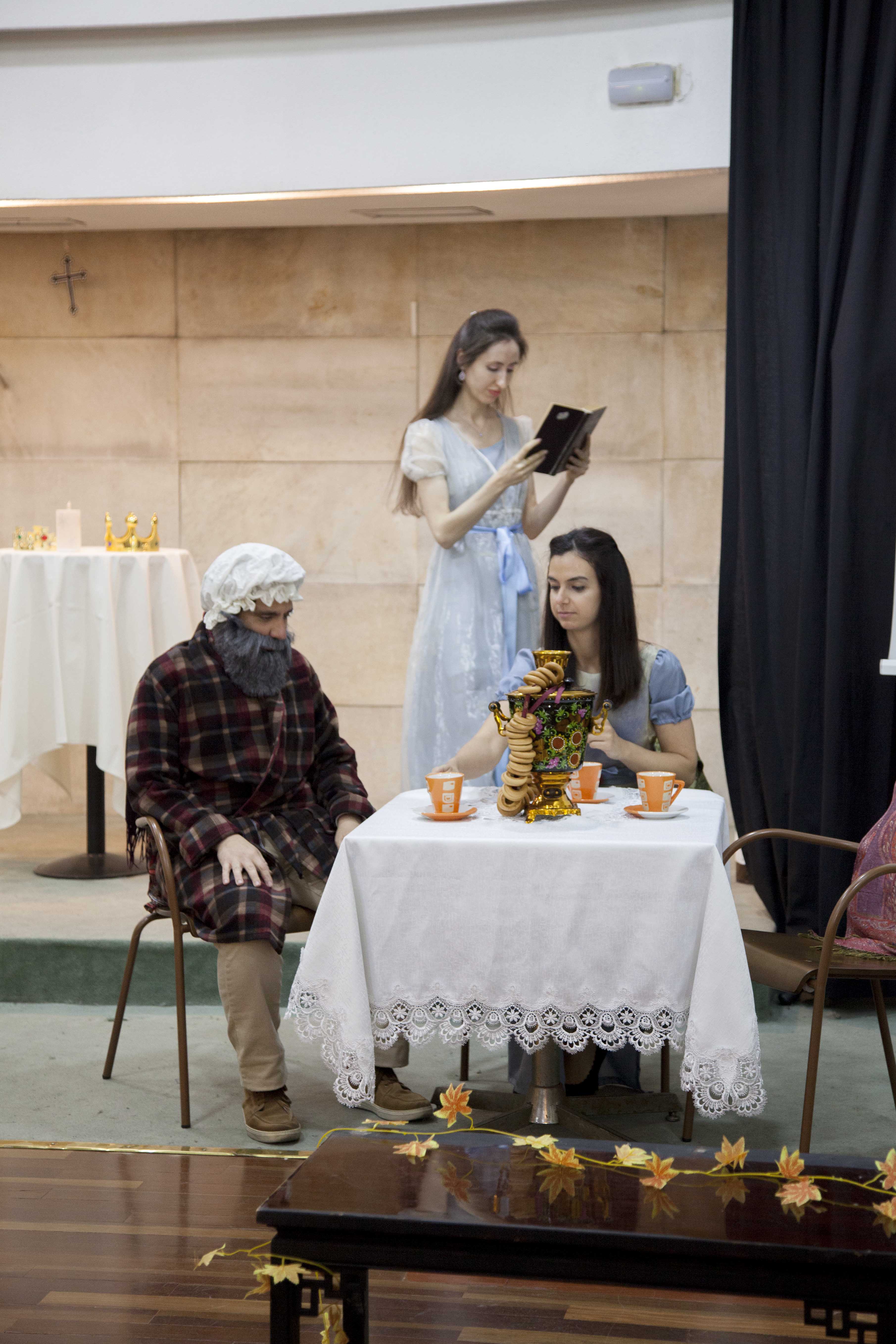 La compañía ensaya dos veces al mes los sábados por la tarde y suele preparar dos obras por año académico que se estrenan en la Fiesta de Navidad y en la Fiesta de fin de curso del Instituto, así como en otros sitios diferentes, según la temática de cada obra. Las obras suelen tener partes en ruso y en español, lo que permite que los ensayos no sólo sean divertidos sino también útiles. Si eres nuestro alumno, sientes esa inquietud escénica y quieres formar parte de nuestra compañía, no dudes en hacerlo. ¡Te esperamos!